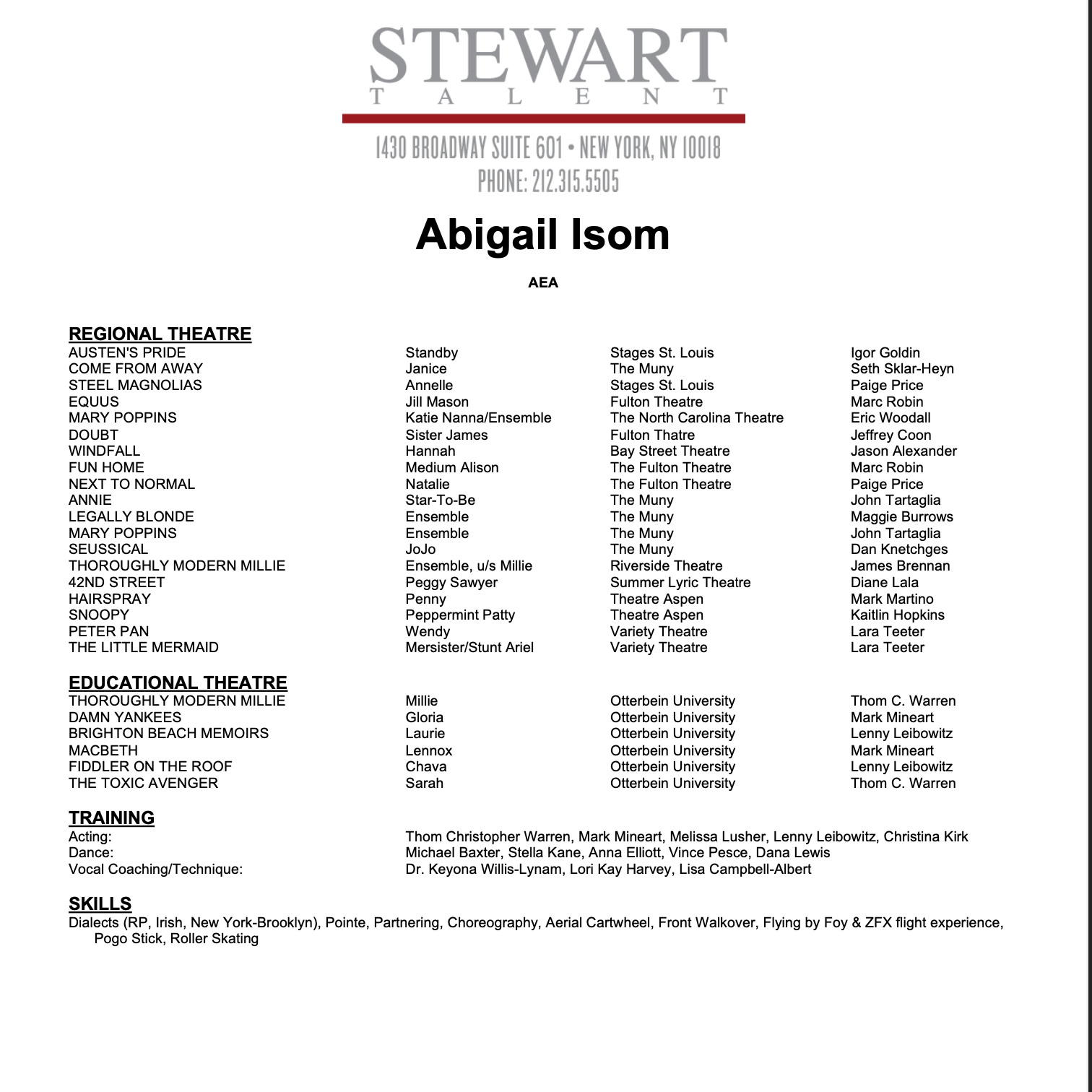 Abigail Isom is a New-York based actor, originally from Saint Louis, MO. Born into a family of actors, she grew up “in the biz” making her professional debut as Tootie in Meet Me in St. Louis at Stages St. Louis when she was 8 years old, alongside both of her parents. She also grew up performing at The Muny in dozens of shows including, the title role of Annie in ANNIE (2009) and most recently, Janice in COME FROM AWAY (2025). Abigail attended Otterbein University where she graduated with a BFA in Musical Theatre with a concentration in dance.
